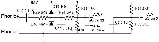 The circuitry on the ECU to handle this signal is show in the following figure. The engine position signal is AC coupled so that it can be centered within the microcontroller's supply voltage. It is then clamped by the two diodes to be within 0.6V of the supply voltage at all times. Further attenuation is provided by the resistive divider to fully keep the signal within the supply voltage. The signal is then passed to the microcontroller on input ADC7 - a analog to digital conversion channel, and also AC+ - an input to an on chip voltage comparator. The other input to the voltage comparator AC- is generated from another resistive divider set just above the middle of the supply voltage. The upshot of all this is to generate an interrupt in the microcontroller every time the above waveform rises above the centre. This approaches 10 thousand interrupts per second at engine speeds approaching red line.
