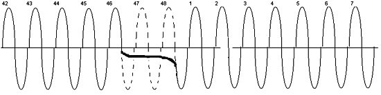 The engine position input is derived from an inductive pickup. This pickup is positioned to monitor a 48 toothed wheel spinning at half the speed of the crankshaft. There are two consecutive teeth missing from the wheel and this gap is what tells the ECU exactly what the position of the motor is. The speed of the motor is calculated from the time between the individual pulses. The waveform is basically sinusoidal and looks like the figure below.
